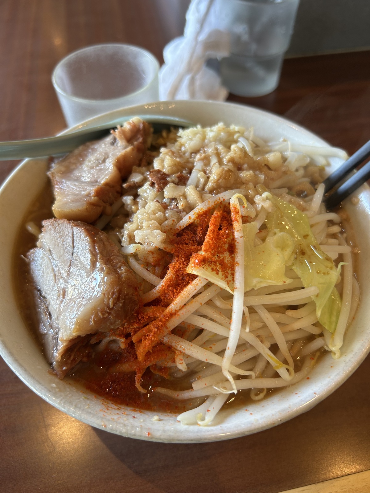 山のようなもやし、分厚いチャーシュー、